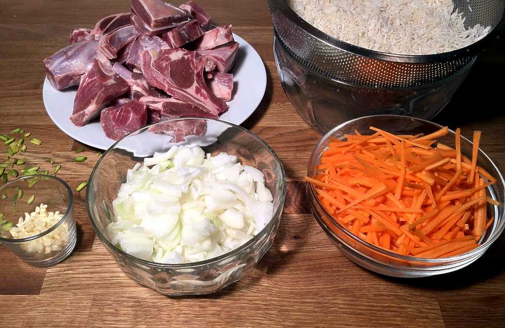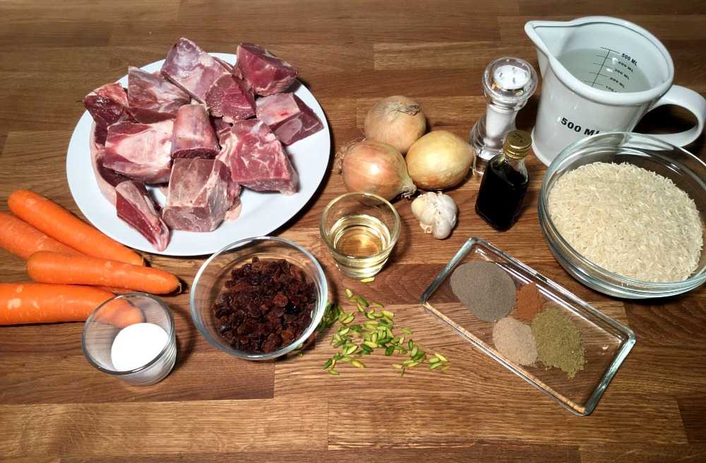 Skyll tørk lammekjøttet (og kutt det eventuelt i passe små biter). Kutt løken i terninger. Hakk hvitløken. Skrell gulrøttene og kutt dem i strimler på størrelse med fyrstikker (for dem som husker hva det var). Skyll risen 2-3 ganger, la den trekke vann i 3-4 minutter, og la den så tørke lett i et dørslag.