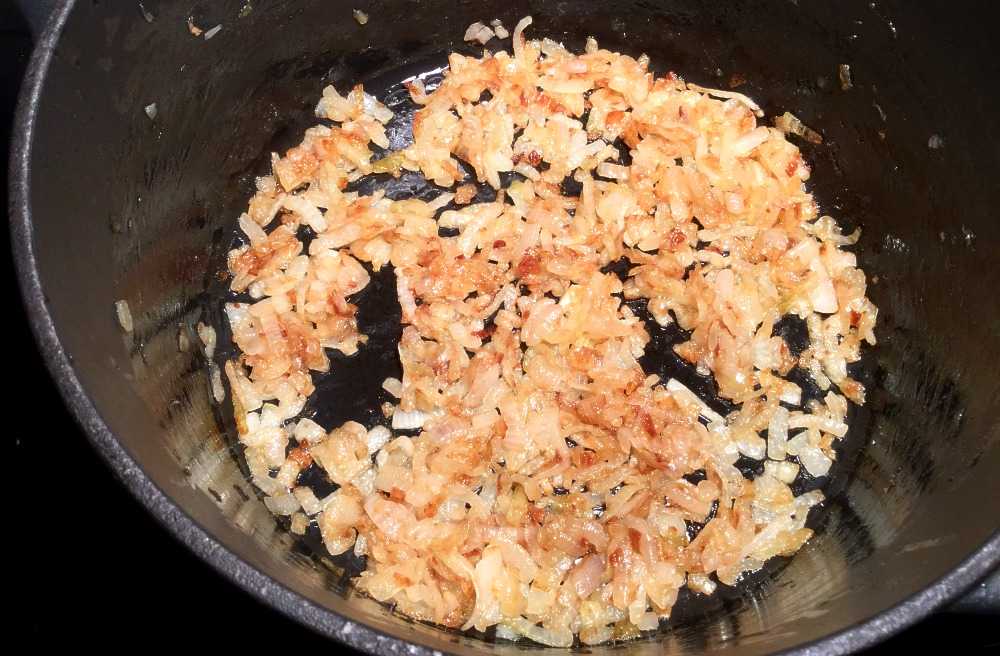 Varm olje i en massiv gryte som tåler å settes i ovnen. Brun den hakkede løken i oljen. Stek på svak varme, i rundt 20 minutter. Løken skal være skikkelig brun (karamellisert) men ikke svidd.