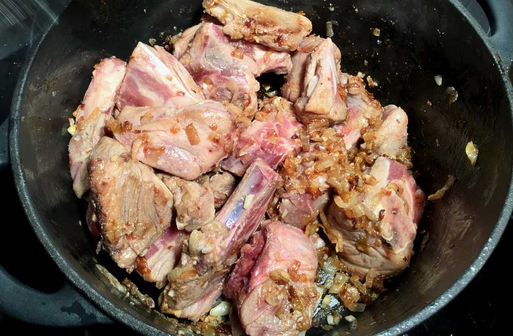Skru opp varmen igjen, rør så hvitløken inn i løkgryten, og kort deretter lammekjøttet. Brun kjøttet lett, i rundt 5 minutter.