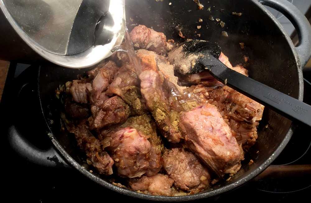 Rør inn saltet og krydderene. Slukk så med litt av vannet. La fordampe og ha i resten av vannet. Kok opp. La småkoke under et tett lokk (tett eventuelt med aluminiumsfolie eller legg på en vekt) i minst 1 time, eller til kjøttet er godt og mørt (smak!).