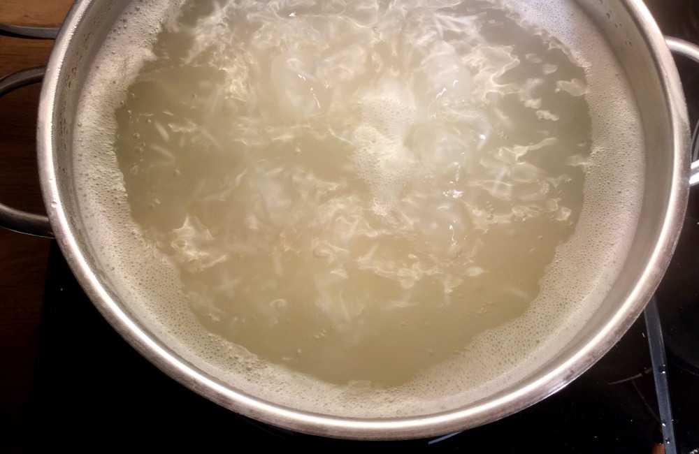 Hell så risen gjennom et dørslag (og fjern kokevannet). Risen skal nå i gryten med kjøttkraften.