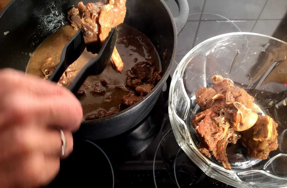 Når kjøttet er ferdigkokt, tas det ut av kraften og settes til side.