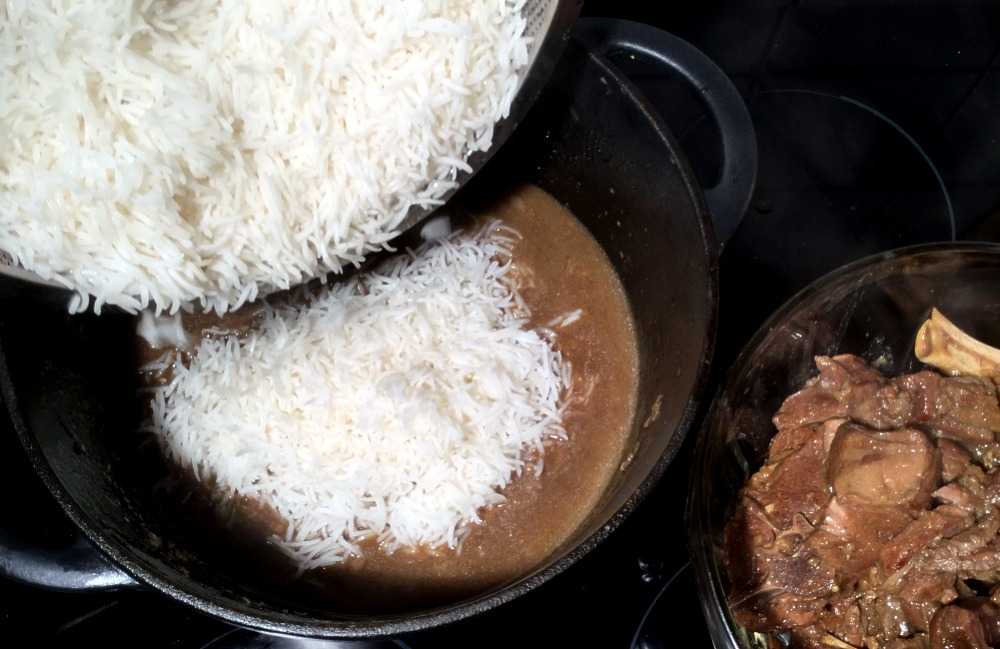 Bruk skaftet på en skje eller sleiv til å lage hull (dvs. luftekanaler) i rishaugen. Legg kjøttet forsiktig oppå risen. Sett på lokket, og plasser gryten i den forvarmede stekeovnen (200 °C). Her skal den stå i 30-40 minutter.