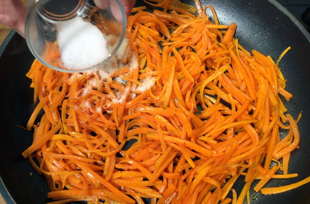Imens forberedes gulrøtter og rosiner: Hell kun litt olje i en stekepanne, varm denne og stek gulrotstrimlene til de blir bløte. Når de mykner godt, hstrøs sukkeret i pannen. NB: Ikke bruk for høy varme – gulrøttene skal beholde sin oransje farge!