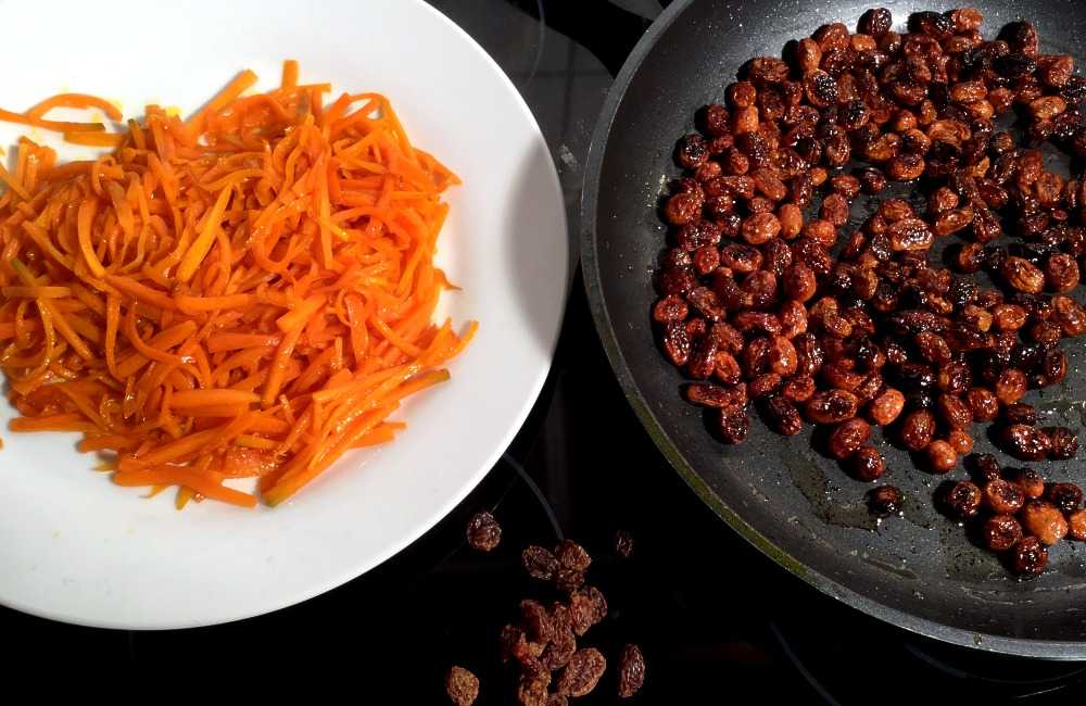 Legg de ferdige gulrøttene til side, og hell rosinene i pannen, sammen med noe mer olje. Stek rosinene på middels varme til de har est noe opp (og rist eventuelt også noen hakkede mandler).
