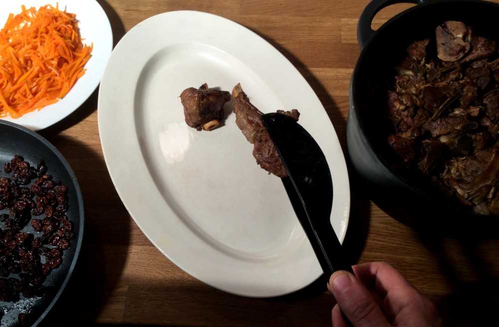 Sjekk om risen er ferdig før pilaffen tas ut av stekeovnen for godt. Plukk så ut kjøttet fra risen. Dette kan legges rett på serveringsfatet.